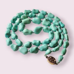 Beskrivning: Halsband med bärnsten. Skruvlås i metall. Skick: Stenarna har naturliga ojämnheter. En av stenarna har troligen gått sönder vid något tillfälle då den har vassare kanter än övriga stenar, se bild.