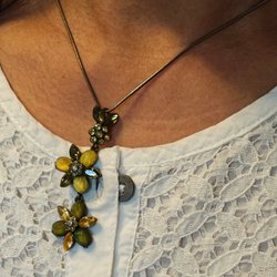 Ett vackert halsband med tre lager. Det översta lagret har en nyckelberlock, det mellersta ett hänglås och det nedersta ett hjärta med en siluett av ett par.