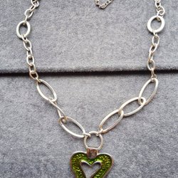 Halsband med ett triangulärt, grönt hänge och en silverfärgad kedja.