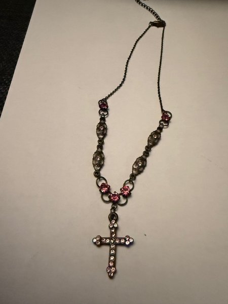 Ett vackert halsband med ett kors som hänge. Halsbandet har detaljer med rosa stenar och dekorativa metallpärlor.