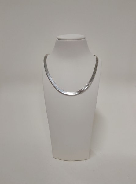 Detta halsband är tillverkat i silver med en silverhalt på 825, vilket innebär att det är av en godkänd standard för silver. Kedjan har en bredd på cirka 5 mm och en längd på ungefär 25 cm, vilket ger en elegant passform. Vikten är lätt, cirka 0,5 gram, vilket bidrar till en behaglig känsla vid bärande. Noteras bör att kedjan är silverpläterad massing och uppvisar skador, vilket kan påverka dess utseende och hållbarhet.