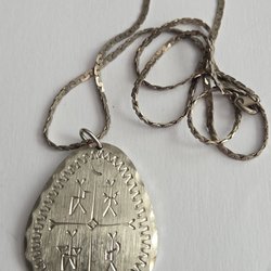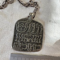 Tenn halsband. Längd 65 cm hängets Längd 13,5 cm Bredd 9 cm. I fraktavgiften ingår emballage