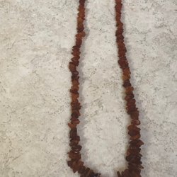Beskrivning: Halsband med bärnsten. Lås i guldpläterad metall.