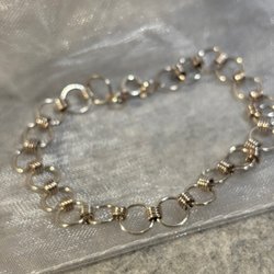 Ett silverfärgat halsband med små hängen i form av cirklar och ringar.