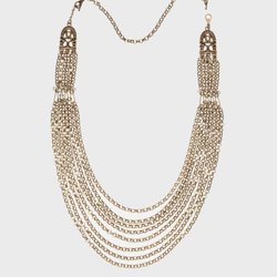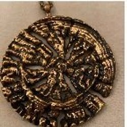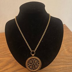 Ett halsband med en antik bronsfärgad kedja och ett runt hänge. Hänget har ett mönster runt kanten och en solliknande design i mitten. Märke: Robbert.