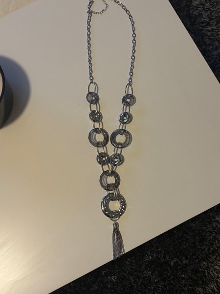 Ett silverfärgat halsband med en kedja och dekorativa ringar i olika storlekar. Halsbandet avslutas med en hängande tofs av kedjor.