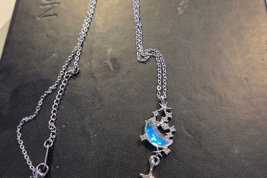 Ett vackert halsband med ett måne- och stjärnmotiv. Halsbandet har en silverfärgad kedja och ett hänge med en halvmåne dekorerad med små strass-stenar och stjärnor. En extra stjärna hänger nedanför månen.