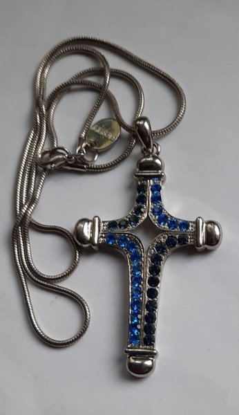 Ett vackert halsband med ett korsformat hänge. Hänget är dekorerat med blå stenar i olika nyanser.