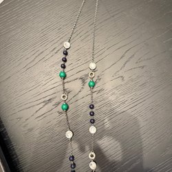 Halsband med ett triangulärt, grönt hänge och en silverfärgad kedja.
