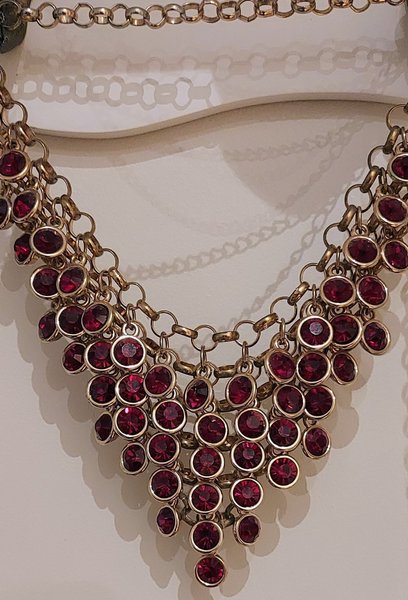 Läckert halssmycke som ligger snyggt runt halsen. Justerbar längd. Härligt djupröd färg på stenarna