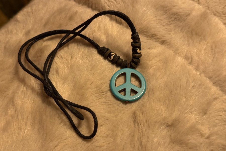 Ett halsband med ett fredsmärke som hänge. Halsbandet har en svart snodd och dekorativa pärlor.