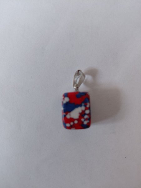 Ett hänge i rött vitt blått. Känns som glas men kan vara av annat material längd inkl ögla cirka 20-25mm Svart halsrem ingår 45 cm lång plus 5 cm förlängningskedja. VIkt cirka 5g Samfraktar givetvis.