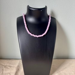 Ett elegant pärlhalsband med varierande pärlstorlekar. Halsbandet har ett vackert spänne med dekorativa stenar.