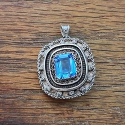 Hängsmycke form av ett hjärta med livets träd och en gnistrande blå sten