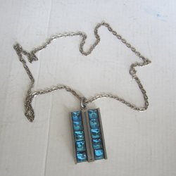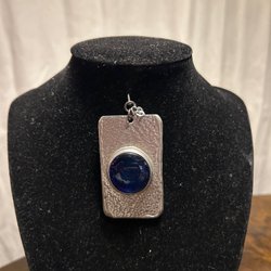Ett vackert hänge i tenn med en stiliserad blomma. Hänget är signerat "Tenn" och "R. Linderholm" på baksidan. Hänget hänger i ett svart läderband.