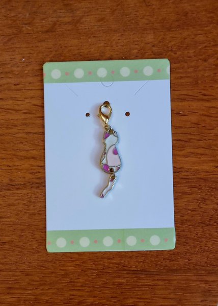 En söt hänge/charm formad som en katt. Cirka 4,5 cm. Kan hänga på nyckelring, mobilsmycke, ryggsäck, väskhänge, m.m. Perfekt present till en katt älskare eller dig själv.