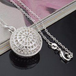 Medaljong i sterling silver som mäter 29 x 22 mm och väger 5 gram. Hänget kan öppnas för att förvara foton eller andra små minnessaker inuti.