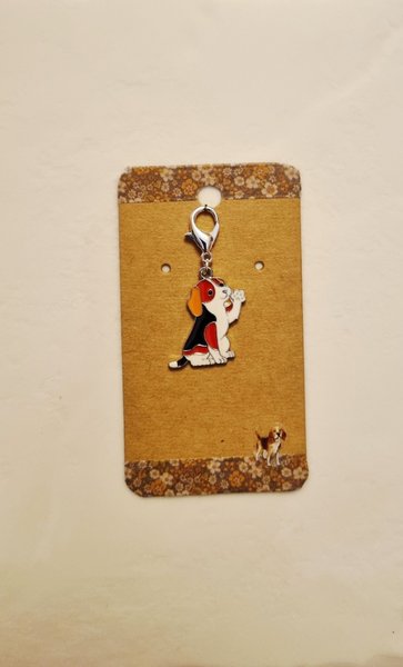 En söt hänge/charm formad som en emaljerat beagle. Cirka 4 cm. Kan hänga på nyckelring, mobilsmycke, ryggsäck, väskhänge, m.m.. Perfekt present till en hundälskare.