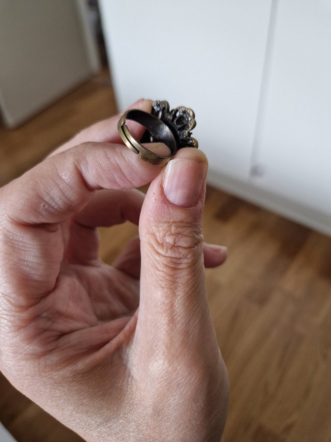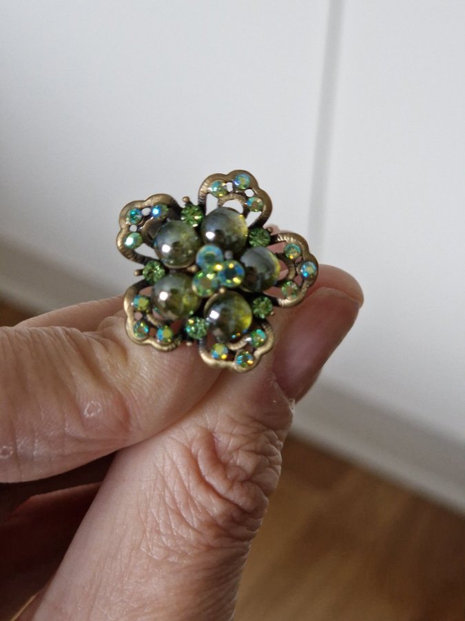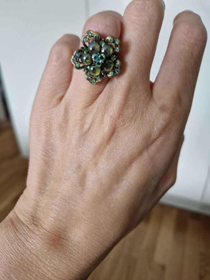 Justerbar ring i form av en blomma, gröna samt blå stenar vintage look. Pilgrim