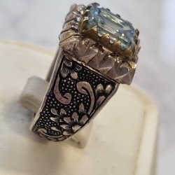 Snygg ring med en stor, rektangulär blå sten. Ringen har detaljer med mindre stenar på sidorna. Storleken är cirka 18 mm i diameter.