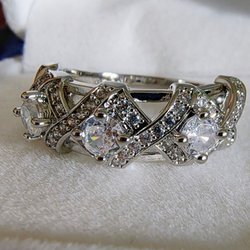 Designen är fantastisk: massor av klara, briljantslipade stenar i olika storlekar trängs om utrymmet på framsidan likt bubblor i ett glas champagne. Varje sten är omsorgsfullt infattad i silver (så kallad sargfattning), vilket ger ringen en härlig struktur och en slät yta som inte fastnar i kläder.