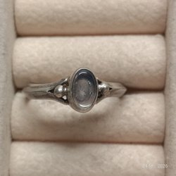 Silverring i äkta silver med 925-stämpel invändigt. Ringen är infattad med en grön mittsten i cabochonslipning samt två mindre, ljusare sidostenar. Exakt stensort är okänd och säljs därför utifrån utseende och utförande.