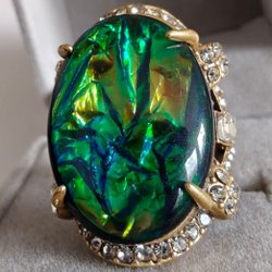 I centrum tronar en gigantisk, djupt grön ädelsten som utstrålar tidlös auktoritet. Den omfamnas av 5A Kubisk Zirkonia – stenar av absolut högsta kvalitet som valts ut för att matcha diamanters klarhet och lyster.