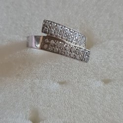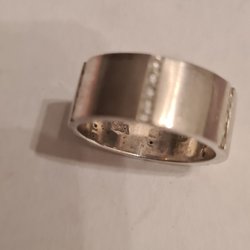 Ring i sterling silver 925 Esprit märke,18 i storlek. Stenar i kubiskt zirkonia på framsidan ringen men inte runt hela ringen. 11 gram silver, samt 8 mm i bredden.Alla stenar finns.Delen med stenar är 4 mm i bredden.