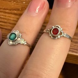 Säljer två fina silverringar. Den ena ringen är prydd med mörkblå stenar i ett blommönster, medan den andra ringen har en bredare design med flera rader. Båda ringarna är i gott skick.