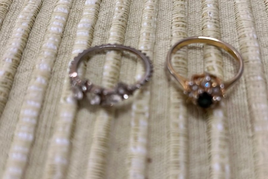 Två ringar i okänd metall. En ring med vita stenar runt om och en ring med en mörk sten omgiven av vita stenar.