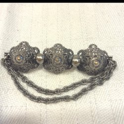 Ring med dekorativa pärlor och stenar i olika färger. Metallen har en mörkare, antiksilver finish.17/18 mm diam.