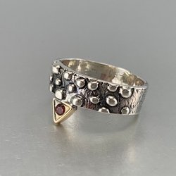 Elegant silverring med intrikata detaljer . Ringen har en unik design som kombinerar silver och koppar på ett smakfullt sätt. Perfekt för den som söker en speciell och iögonfallande accessoar.