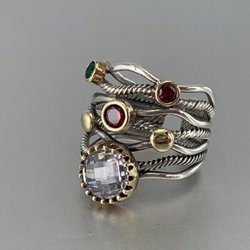 SILVERRING MED SYNT. EMERALD OCH GULDDETALJER I KOPPAR