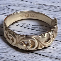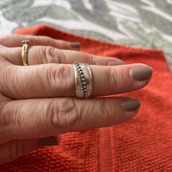 Ringen har ett mönster av cirklar och detaljerade kanter.