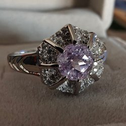Tre stora, klara lila kubisk zirkonia i centrum, omgivna av mindre gnistrande stenar