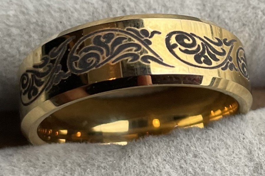 Tungsten / volframkarbid: Hårdaste metallen på jorden, 9 på Mohs hårdhetsskala, näst efter diamant med hårdhet 10. 5 gånger så hårt som stål och 10 gånger så hårt som guld. Vill du ha en ring som varar hela livet och inte blir repig så är tungsten ett bra alternativ. 21,8mm i diameter och 8mm bred.