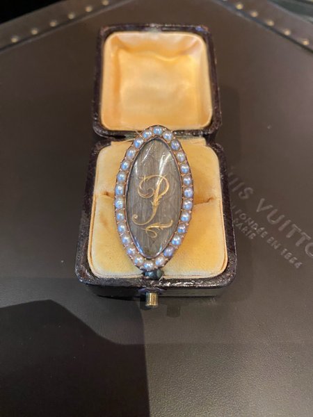 Empires guldring 14 karat med små kultur perler indlagt hår og initial p l 3,5 cm b 2,5 cm ring størrelse 50
