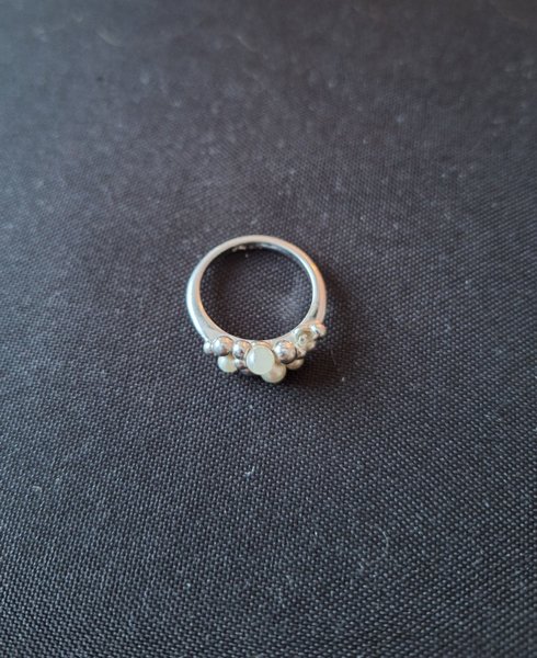 Silverring med majoricapärlor. En pärla har dock lossnat. Mått 18 mm.
