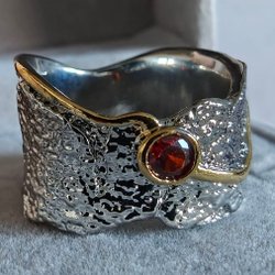 En fantastisk och annorlunda ring för dig som vill bära något unikt. Designen är konstnärlig med en rå, hamrad yta som bryts av mjuka, vågiga strömmar av guld. Det här är ett hantverk som syns och känns.