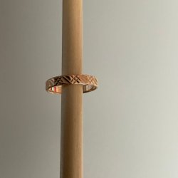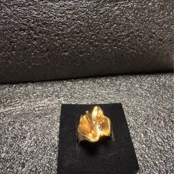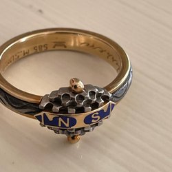 En gammal förlovningsring från 60-talet, 18 k guld. Ett lager med vitguld och ett med gult guld med stenar i som jag inte vet om det är diamanter eller inte. Vikt ca 4 g. Storlek 20 mm i diameter.