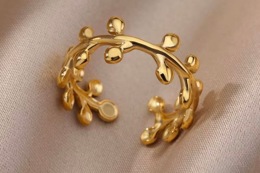 Elegant ring i guldpläterad rostfritt stål med en vacker lövdesign. Justerbar storlek för bekväm passform.