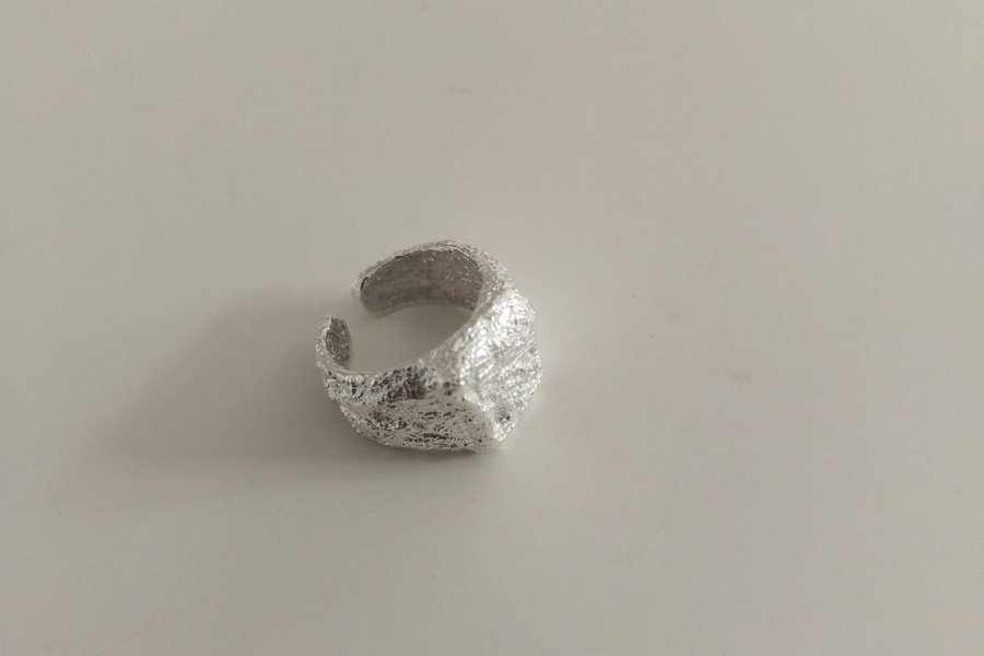 Sølvfarvet ring med en unik tekstur. Ringen er justerbar i størrelsen.
