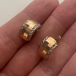 Örhänge, litet guldfärgat. Både metallstopp bak och plaststopp.Tillverkad av återvunnen metall. 0,5cm i diameter. Ny oanvänd