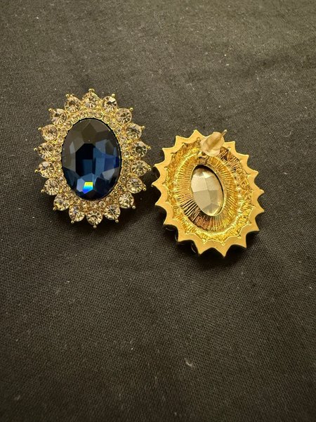 Ett par örhängen med en stor blå sten omgiven av mindre klara stenar i en guldfärgad infattning. Baksidan är guldfärgad med stiftfäste.