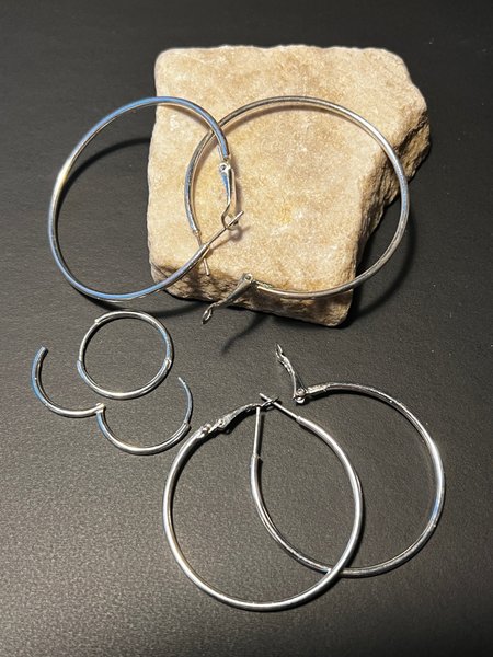 Set med tre par runda örringar, 6/5 samt 2,5 cm i diameter. De två större är ej använda.