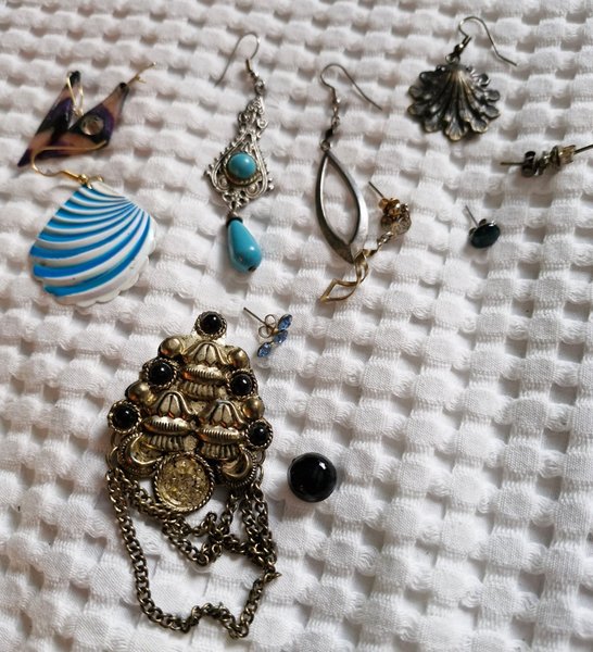 Strass örhängen och en brosch där en sten har lossnat.