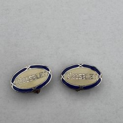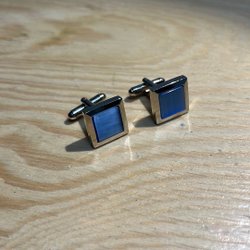 Ett par rektangulära manschettknappar med en blå emaljliknande färg och en liten silverfärgad kvadrat inuti.