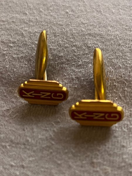 Ett par manschettknappar med texten "KING" i röd text på en guldfärgad bakgrund.