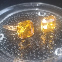 Ett par rektangulära manschettknappar med ett distinkt mönster i svart och guld.