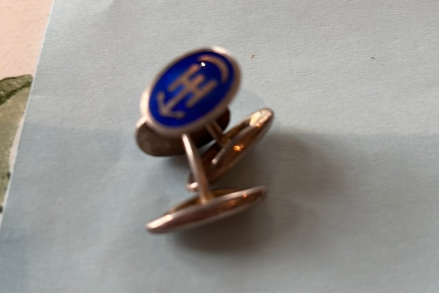 Ett par manschettknappar med en oval form och en blå emaljerad yta. På den blå ytan finns en guldfärgad symbol som liknar ett ankare eller en stiliserad bokstavskombination. Manschettknapparna har en klassisk design och är lämpliga för formella tillfällen. Eftersom dessa kommer från ett dödsbo så vet jag inget mer, men synd att kasta om nån samlar på liknande.